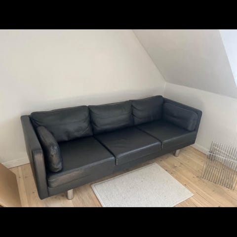 Pæne men brugte lædersofaer med træstel. Særlig en pude er medtaget - se billede.