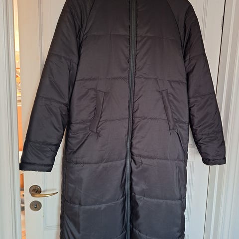 Dejlig varm og lang, sort vatteret jakke med hætte og lynlåslukning som kan åbnes begge vej, er foret med blødt teddyfor.
