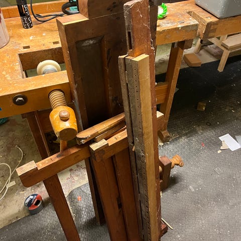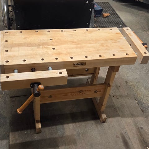 Træarbejdsbænk fremstillet i træmateriale. Bænken har en lang, rektangulær bordplade med en forhøjning langs kanten, hvilket kan bruges til at holde værktøj eller materialer på plads under arbejde. Bænken er designet med ben i træ og understøttende tværstivere for stabilitet. Velegnet til forskellige former for håndværks- og reparationsarbejde.