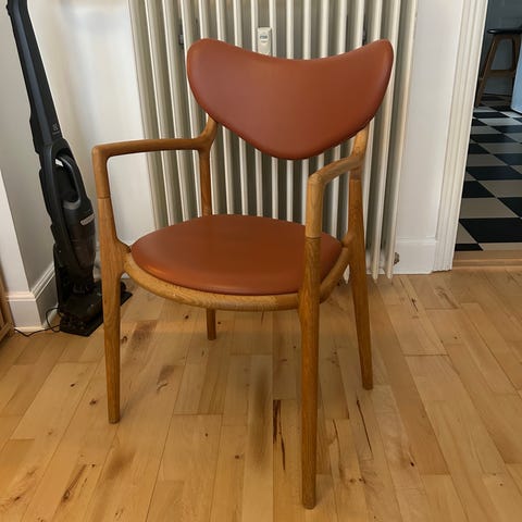 En sjælden skønhed, samtidig med at det er en yderst behagelig stol med unik siddekomfort, førsteklasses polstring og snedkerarbejde.