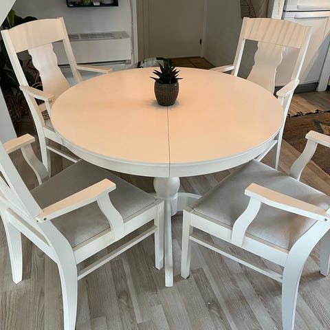 Spisebord med 4 spisebordstole og 2 spisebordstole med armlæn. Alt er i god stand. Det hele er 2 1/2 år gammelt. Det kommer fra ikke ryger hjem.