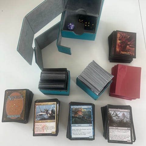 8 Magic deck, nogle af dem er færdiglavede og nogle af dem hjemmelavede. Der mangler måske meget få kort i de færdiglavede, men det tror jeg ikke. Så følger der også en hel masse løse kort med, som set på billederne. Byd gerne.
