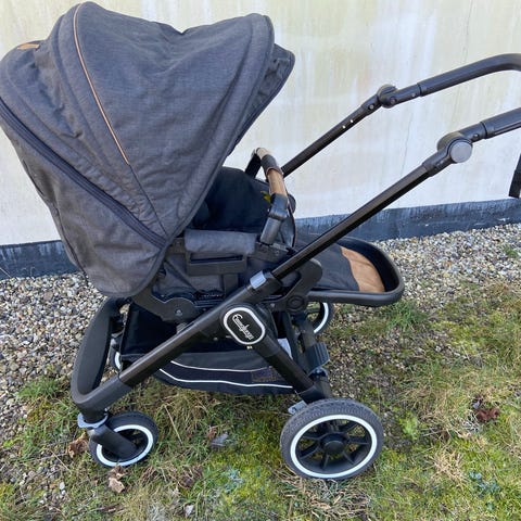 Emmaljunga klapvogn i sort farve med justerbart håndtag og flere siddepositioner. Klapvognen har robuste hjul og polstret sæde, velegnet til børn.