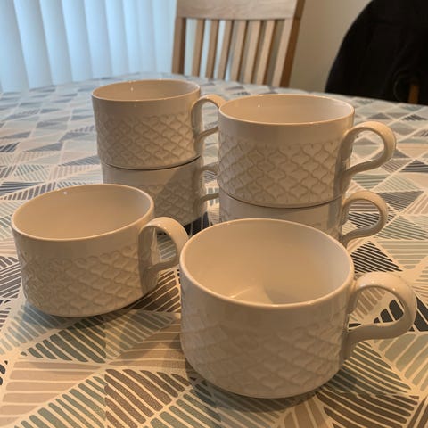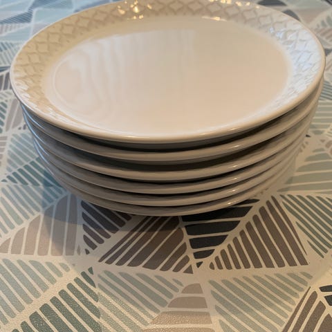 4 kopper med underkop og kagetallerkener sælges samlet. Det er uden skår, Kop H: 6 cm, underkop Ø14 cm nr. 305. Kagetallerkener Ø 16,5 cm nr. 306. Afhentes i Grenaa.