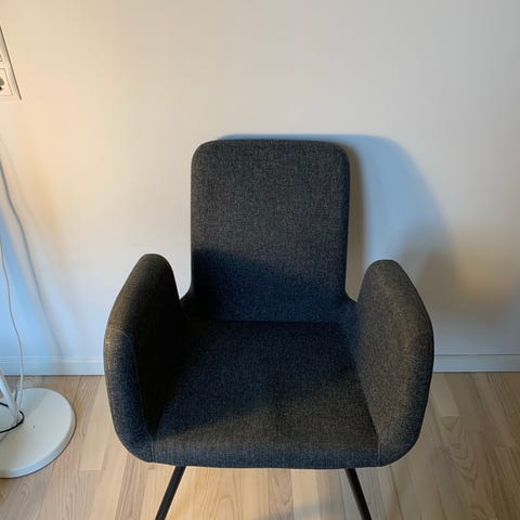 IKEA skrivebord med hvid bordplade og metalben. Kontorstol med grå polstring og justerbar højde, designet til komfort ved skrivebordsarbejde.