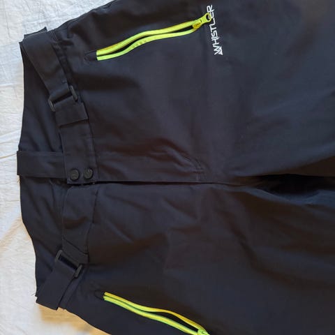 Whistler skibukser til damer i størrelse 36. Bukserne er beige med sorte detaljer og har justerbare stropper. Materialet er designet til at give beskyttelse mod vejr og vind under skiløb.