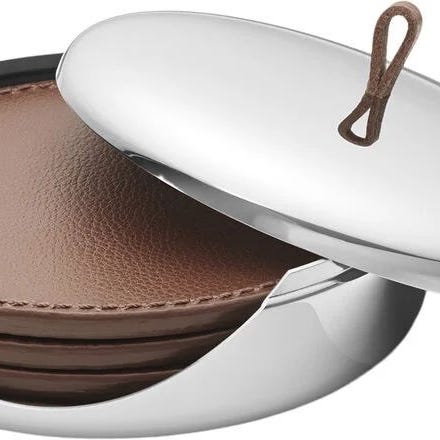 Georg Jensen Coaster sæt bestående af 4 runde skåner i mørkt læder samt en opbevaringsholder. Egnet til beskyttelse af bordflader. Helt ny - aldrig brugt.