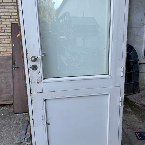 Hvid yderdør med glaspartier og fyldninger