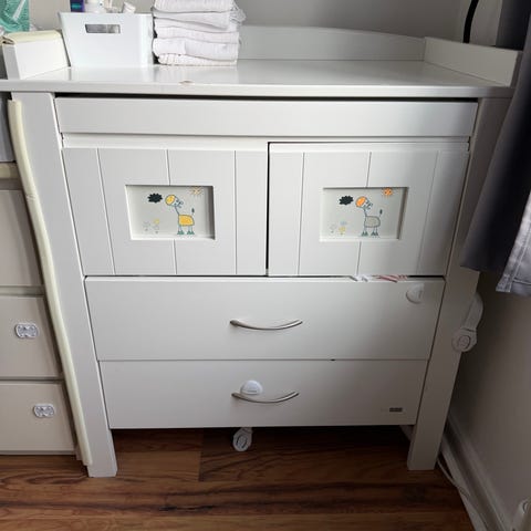 BabyDan væghængt puslebord i metal med hylder til opbevaring. Velegnet til opbevaring af bleer, vådservietter og andre børnerelaterede ting.
