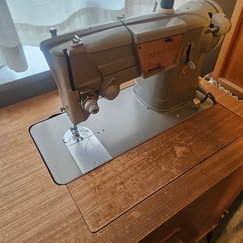 Symaskinebord med træbordplade og støbejernsstel