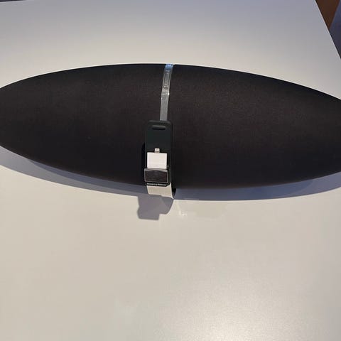 Bowers & Wilkins Zeppelin højttaler i sort farve. Højttaleren har et unikt oval design og leveres med tilhørende kabler og fjernbetjening. Den er egnet til trådløs lydafspilning og kan forbindes til forskellige lydkilder.