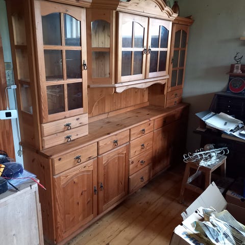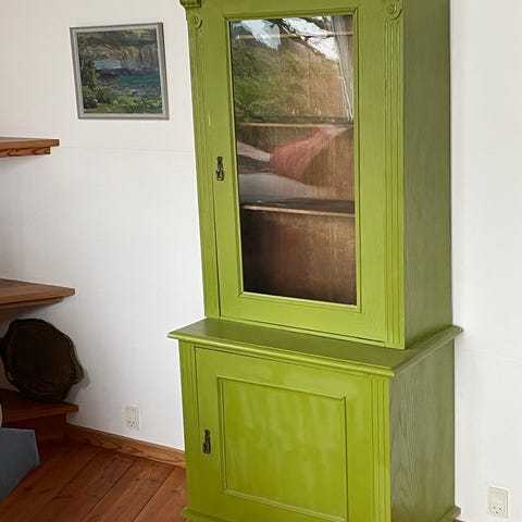 Fineret bøg. Vitrineoverskab med glaslåger og -hylder. Underskab med finerede låger, hylder og skuffer. God stand.