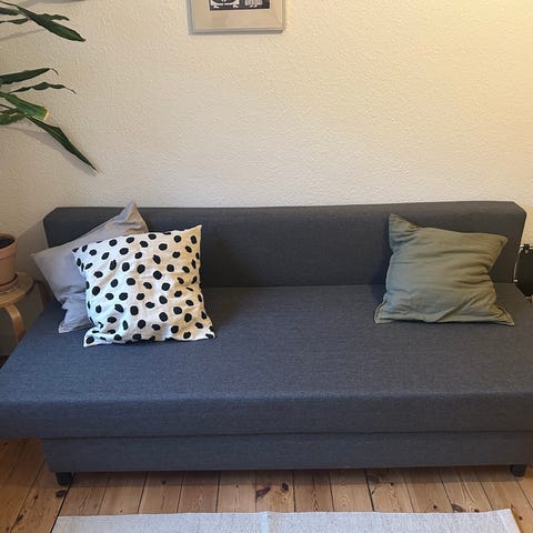 God sovesofa fra Ikea. Udslået/soveplads længde 200cm bredde 120. Betræk kan tages af og vaskes. 2 side puder medfølger.
