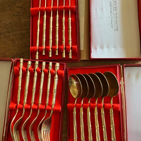 Sæt bestående af 8 messing tallerkener. Tallerkenerne har en blank og reflekterende overflade med variation i patina og farvetoner. Egnet til dekoration eller servering.