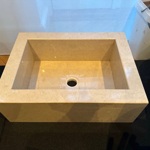 Marmor vask i beige med en rektangulær form og udskæringer til hane og afløb. Vasken har en glat overflade og marmormønster i beige og lyse nuancer. Velegnet til væg installation. Sælges til halv pris da det er en udstillingsmodel.