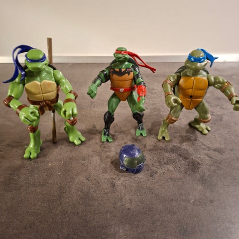 Teenage Mutant Ninja Turtles legetøjsbil med tilhørende figurer. Sættet indeholder en stor bil med åbne døre og forskellige tilbehør samt fire Ninja Turtles-figurer med tilbehør som skateboard, motorcykel og våben. Enkelte brugsmærker og klistermærke sat inde i taget på bilen.