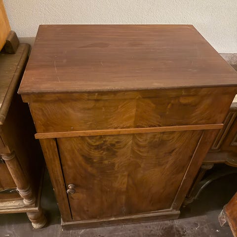 Sødt rundt skab med løs top, som man kan bruge som bakke.