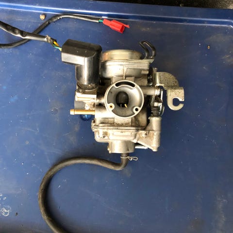 karburator til scooter med tilhørende slanger og kabler. Karburatoren er designet til at regulere luft- og brændstofblandingen til motoren.