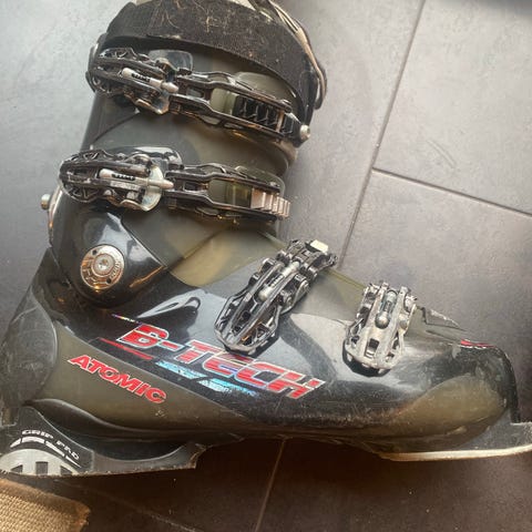 Full Tilt Intuition skistøvler i grå og hvid farve. Skistøvlerne har tre spænder og en justerbar velcrorem ved skaftet. De er designet til at give støtte og komfort under skiløb.