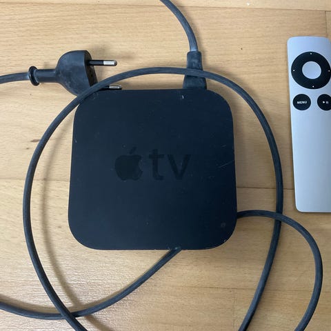 Apple Apple TV med fjernbetjening. Enhed til streaming af digitalt indhold med tilhørende fjernbetjening, HDMI og strømkabel.