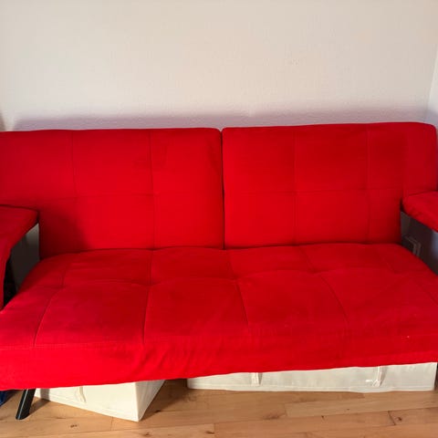 IKEA sovesofa med lysegrå madras og træramme. Sovesofaen kan foldes ud til seng og har en madras med lysegråt betræk. Rammen er lavet af træ med lamelbund. Sofaen kan anvendes som både siddeplads og seng. Der er en lille plet på madrassen, og det ene hjul der bruges til at folde sofaen ud falder nemt af, men ellers er sovesofaen i god stand.