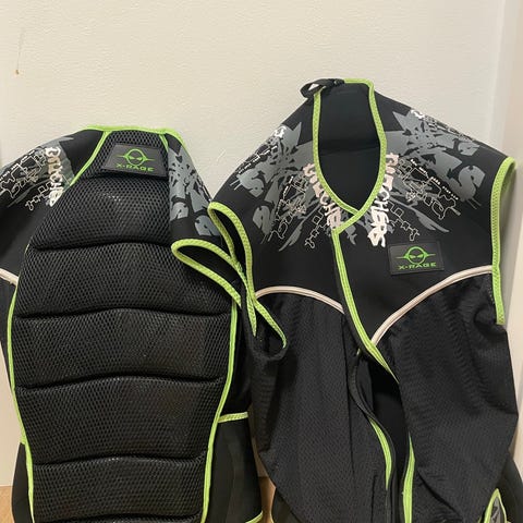 Arva Junior Rygskjold i blå farve, størrelse L. Fremstillet i materiale designet til at absorbere sved, egnet til juniorbrugere. Vesten har lynlås foran og er uden ærmer.