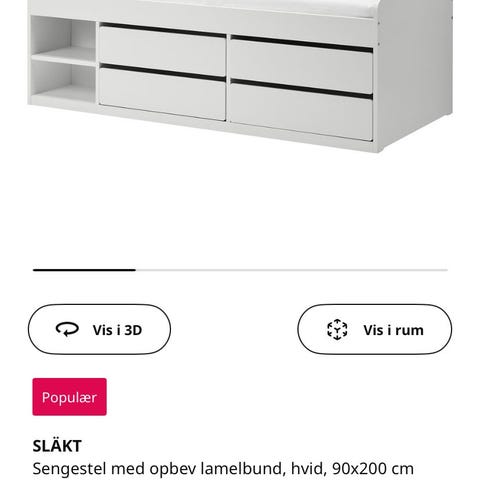IKEA sengestel med underseng og skuffer. Gavlen er skåret i det ene hjørne som vist på billedet, da den har stået op ad en skråvæg. Deraf prisen. Fungerer ellers udmærket. Købt i 2022.