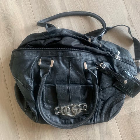 Tasken er ikke ægte og er fra Tyrkiet. Guess kvindetaske fremstillet i andre materialer med mønster. Tasken har en top hank og en justerbar skulderrem. Lukning med lås i front. Designet til kvinder.