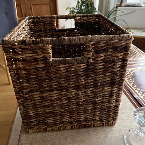 IKEA opbevaringskurv 3 stk Per stk 30krmed flettet materiale og aftagelig hvid stofforing. Kurven er firkantet og kan bruges til opbevaring af forskellige genstande i hjemmet.