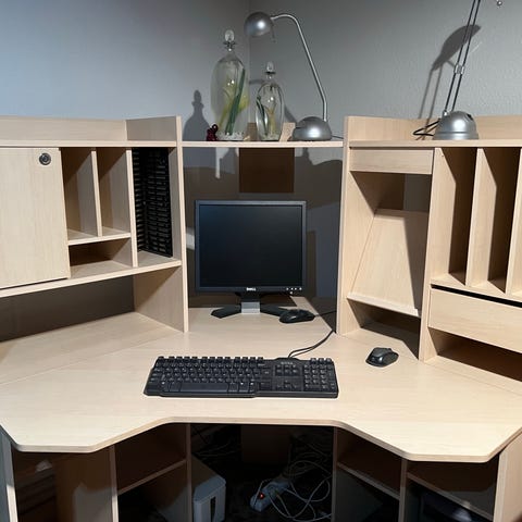 Hjørneskrivebord/computerbord med træbordplade og metalben. Bordpladen har mål på 160 cm, 120 cm, 80 cm og 60 cm på de forskellige sider, hvilket giver god plads til arbejdsområde. Bordbenene er justerbare i højden for tilpasning til gulv og brugerbehov.