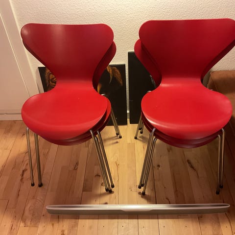 Arne Jacobsen 7’er stole & Spisebord med hvid bordplade og metalben