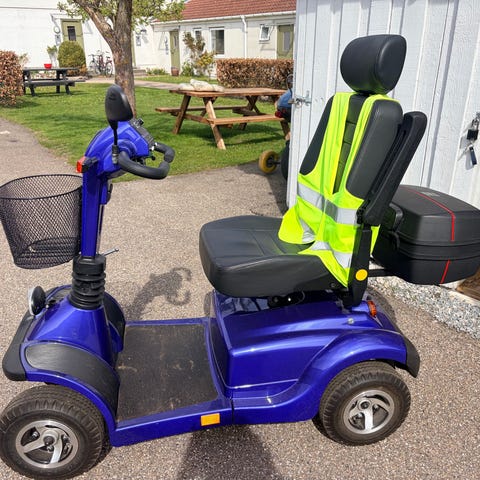 Den har god affjedring, tydelige lys og blink, og en trinløs hastighedsregulering, så man kan sætte tempoet helt ned og fx køre sikkert rundt i supermarkedet.