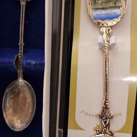 Samling af vintage mors dags og jule skeer med forskellige farverige motiver på skaftet, herunder engle, træ, fugle og mennesker. Skeerne er produceret hos Meka DanmarkVelegnet til samlere eller som dekorative genstande.