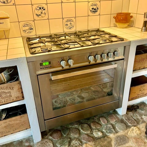 Asko gaskomfur med fem blus. Komfuret har en rustfri stålplade og betjenes med drejeknapper placeret foran. 4 år gammelt.