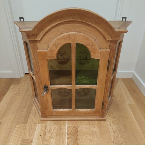 Pænt og velholdt vitrineskab i eg og med glashylder. Har været brugt til spil og krea-ting.