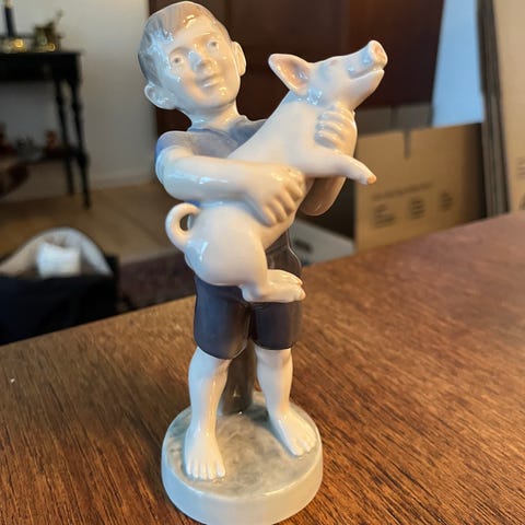 Royal Copenhagen figur af en dreng med en ko, lavet i porcelæn. Figuren er håndmalet med blå og hvide nuancer og viser detaljeret landskab og tøj. Den har modelnummer 772 og er dekoreret med Royal Copenhagens logo på undersiden.