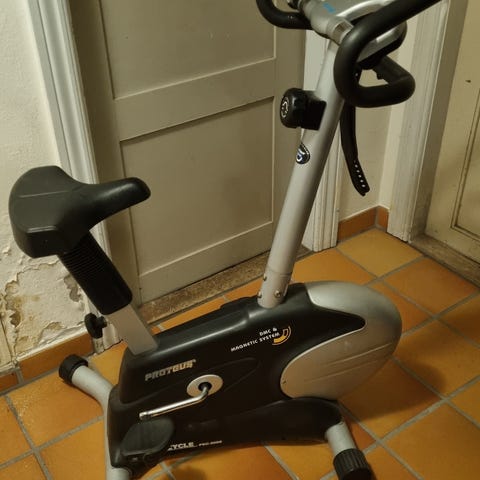 Proteus Cycle motionscykel med digital display, der viser hastighed, distance, tid, kalorier og puls. Cyklen har justerbart sæde og håndtag. Velegnet til hjemmetræning.