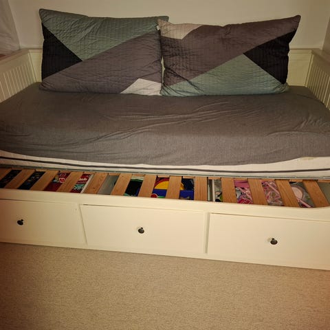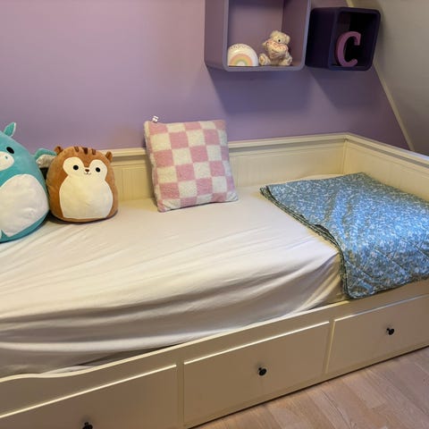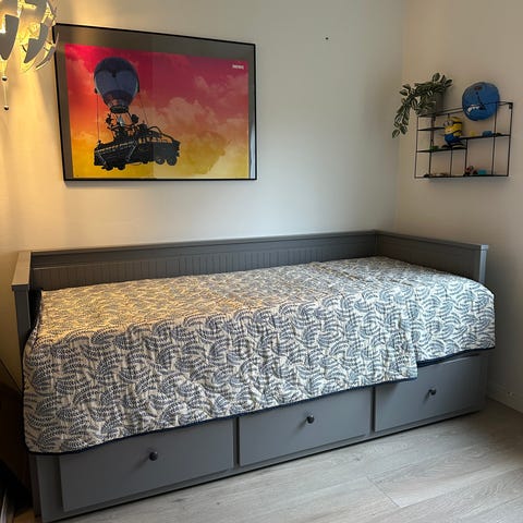 Sengen har opbevaringsskuffer under sovefladen.