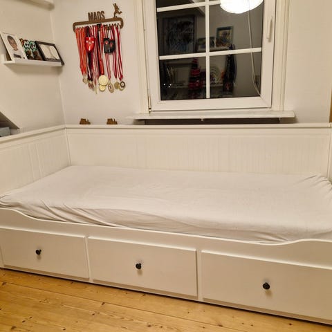 IKEA Hemnes udtræksseng med 3 skuffer i hvid. Sengen inkluderer to gode madrasser som næsten ikke er brugt. Mål: 80x200 cm.