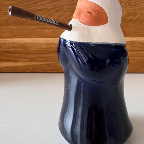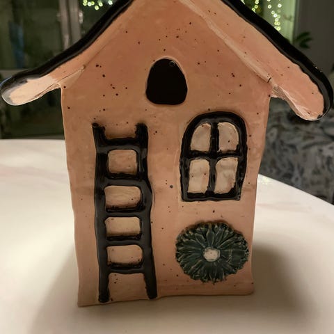 Firkløveren Lars Carlson gårdlåge/fuglehus figur med 3 små blå fugle på, i porcelæn og har en højde på 18 cm.