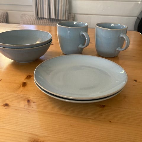 denby blå keramiske kopper og tallerkener. Sættet indeholder flere kopper og tallerkener i blå farve, fremstillet i keramik. Velegnet til brug i køkkenet til servering af drikkevarer og mad.