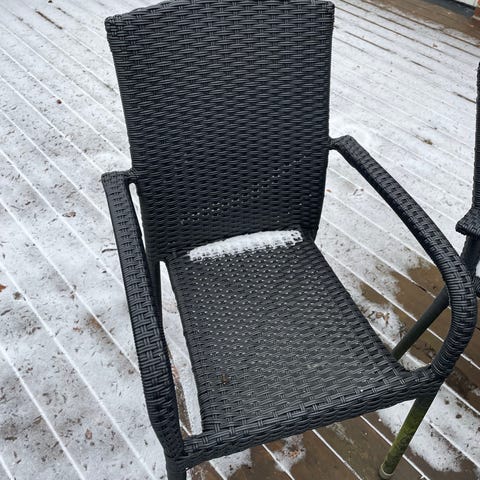 Flet havestole i grå med medfølgende hvide hynder. Stole i flettet materiale egnet til udendørs brug.