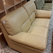 Solgt. Sofa +2 stole i Lys skind med ben i træ. Både stole og sofa kan lænes tilbage.