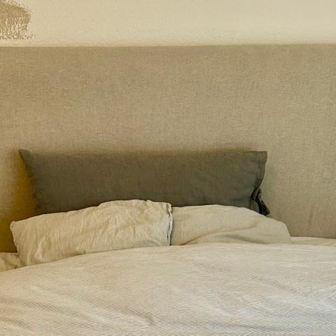 Jotex sengegavl i beige farve med fløjlsbeklædning. Sengegavlen har et polstret design med knapdetaljer og passer til forskellige sengestørrelser.