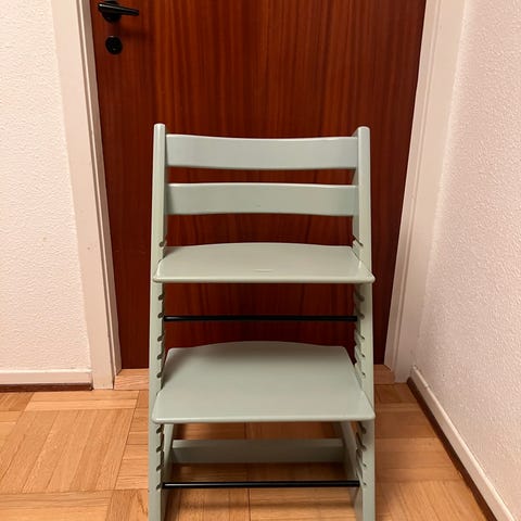 Pastel grøn Tripp Trapp Stokke højstol med alt udstyr inkluderet. Stol, glider, bord/bakke, babysæt/rygstøtte og bojle.