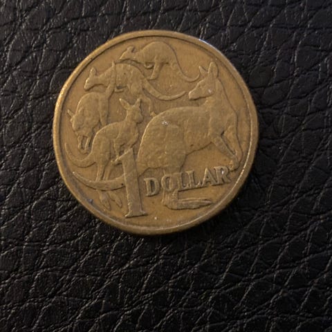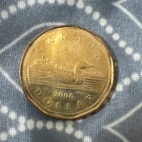 Canadisk 1 Dollar mønt fra 1987 med motiv af en loonie (svømmedue) på forsiden og dronning Elizabeth II på bagsiden. Mønten er ti-sidet og lavet af metal.