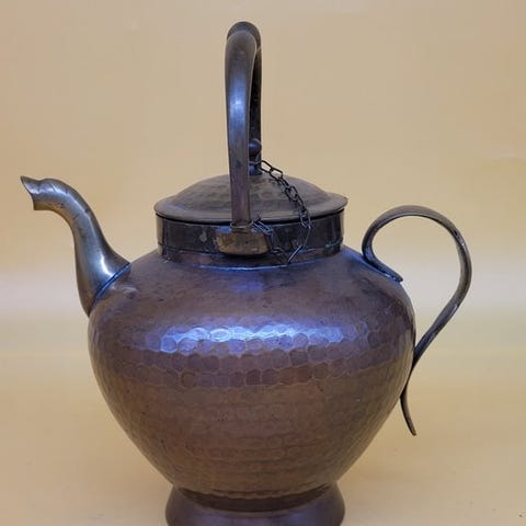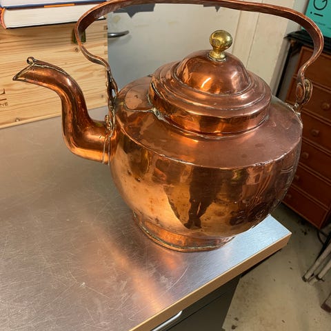 Smuk gammel tekedel i kobber med messingdetaljer ved håndtaget.