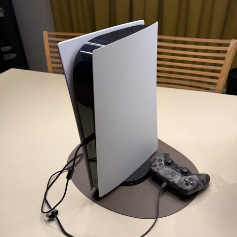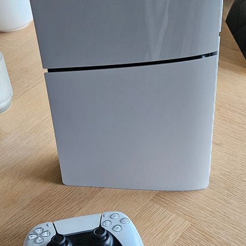 Playstation 5 spillekonsol med to trådløse controllere i sort og hvid. Sælges da jeg sjælden får den brugt,