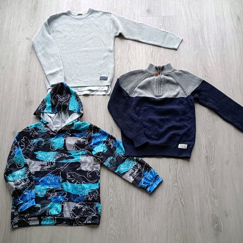 Virkeligt pæne og stilrene, klassiske drengetrøjer i grå, sorte og armygrønne farver. Kun den sidstnævnte hættetrøje har rigtigt været brugt. De to andre fremstår som nye. Den sorte tyndere bomuldsbluse er med Minecraft-motiv. Strikketrøjen er også i bomuld og fra Name It. Fra ikkerygerhjem uden husdyr. Kan sendes eller afhentes i Nørresundby. Prisen er pr. stk. ved køb af alle tre. Sælges også enkeltvis til 40,- pr. stk.