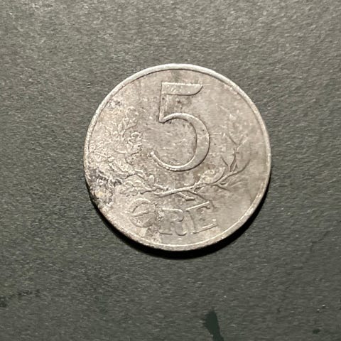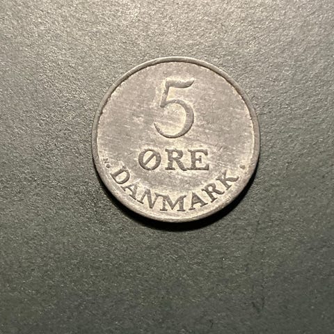 Danmark 5 Øre mønt fra 1936 med hul i midten. Mønten er lavet af metal og har kong Christian X's monogram på den ene side.